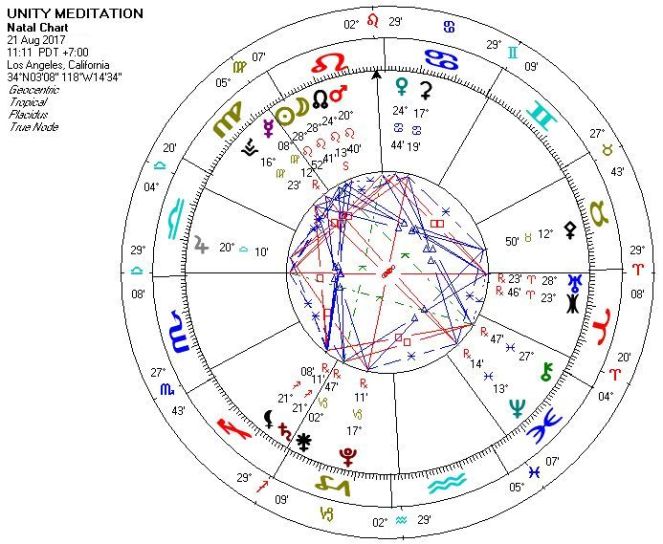 Astrological chart for our meditation shows a powerful grand trine between Galactic center / Saturn / Lilith in Sagittarius, Eris / Uranus in Aries and Mars / Lunar Node / Sun / Moon in Leo. The core of this grand trine is exact grand trine of Galactic Center at 28 degrees Sagittarius, Uranus at 28 degrees Aries and Sun / Moon eclipse at 28 degrees Leo. At the eclipse, the energy of electric fire of liberation will flow from the Galactic Center (the Pleroma) throughout the Solar System and will be channeled through Uranus and through the Sun / Moon eclipse, all of them located in fire zodiacal signs. Therefore our meditation at the moment of the eclipse has a potential for a huge breakthrough on the planetary surface, as it is a moment of the most direct connection with the Galactic Center.
