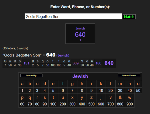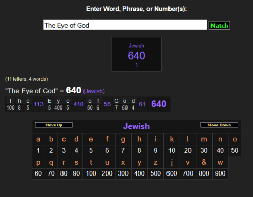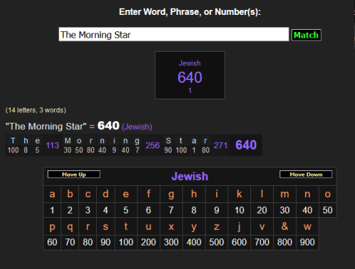640 is the gematria value of ‘God’s Begotten Son’, ‘The Eye of God’ and ‘The Morning Star’ (another name used to identify Jesus, it is not always a title associated with Lucifer):