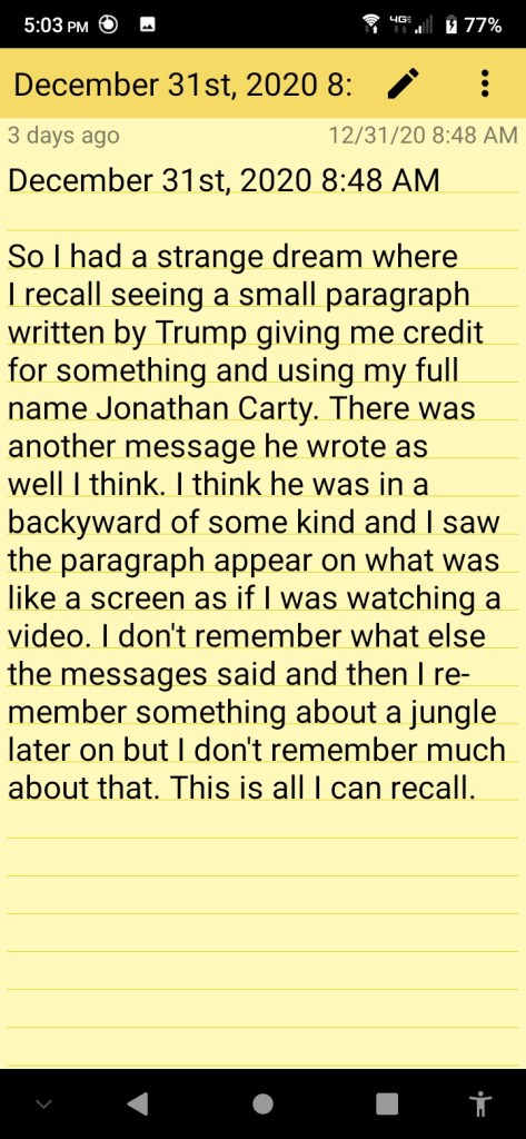 The first dream which I hadn’t ever planned on publishing anywhere was about seeing a message on a screen by Donald Trump which had my name in it along with another one: