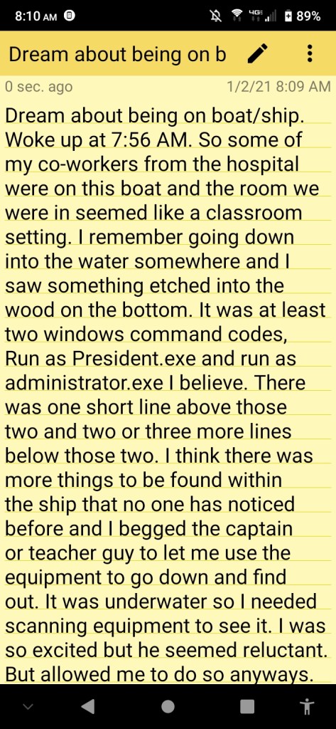 Dream about being on boat/ship. Woke up at 7:56 AM (756 is connected to the magic number 410 in that the divisors of 410 add up to 756.)