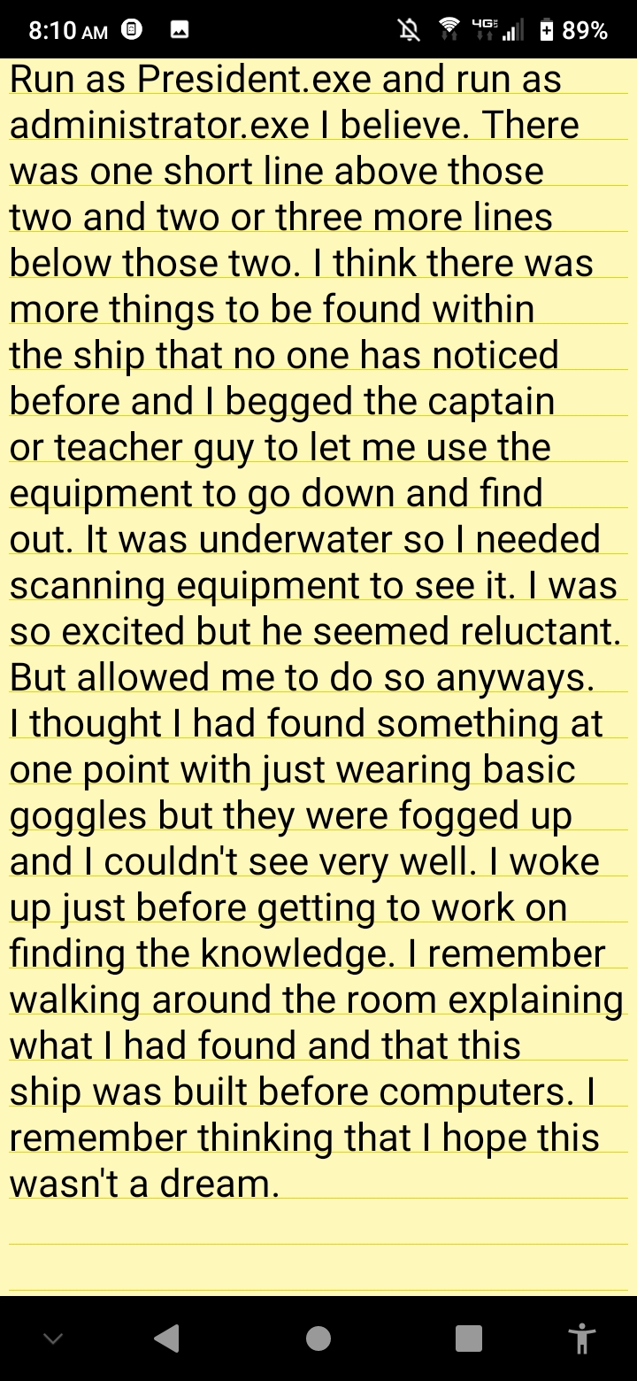 I woke up just before getting to work on finding the knowledge. I remember walking around the room explaining what I had found and that this ship was built before computers.