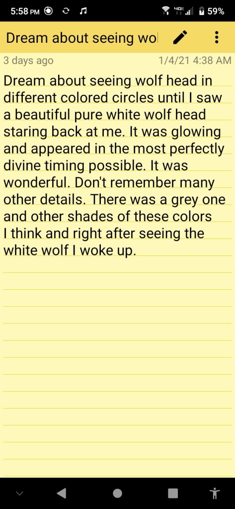 Next was a prophetic dream featuring my spirit animal the wolf which occurred on January 4th: