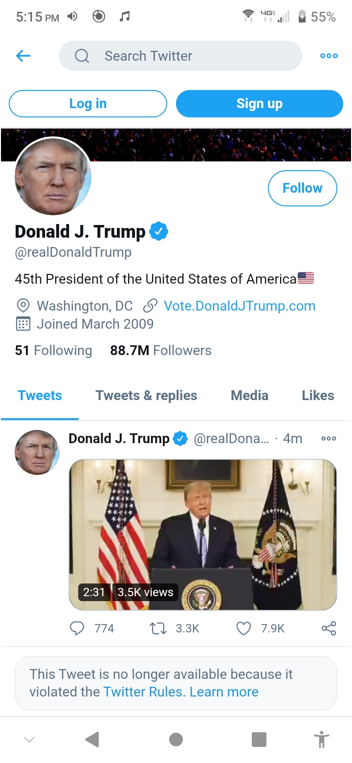 Earlier today I just happened to pull up Trump’s Twitter account and saw that he had just uploaded the video addressing the people about a minute after I had went to the website. I got the screenshot after watching it and the ending was interesting. And for the record I’m not politically inclined either way, I’m just going with the flow:
