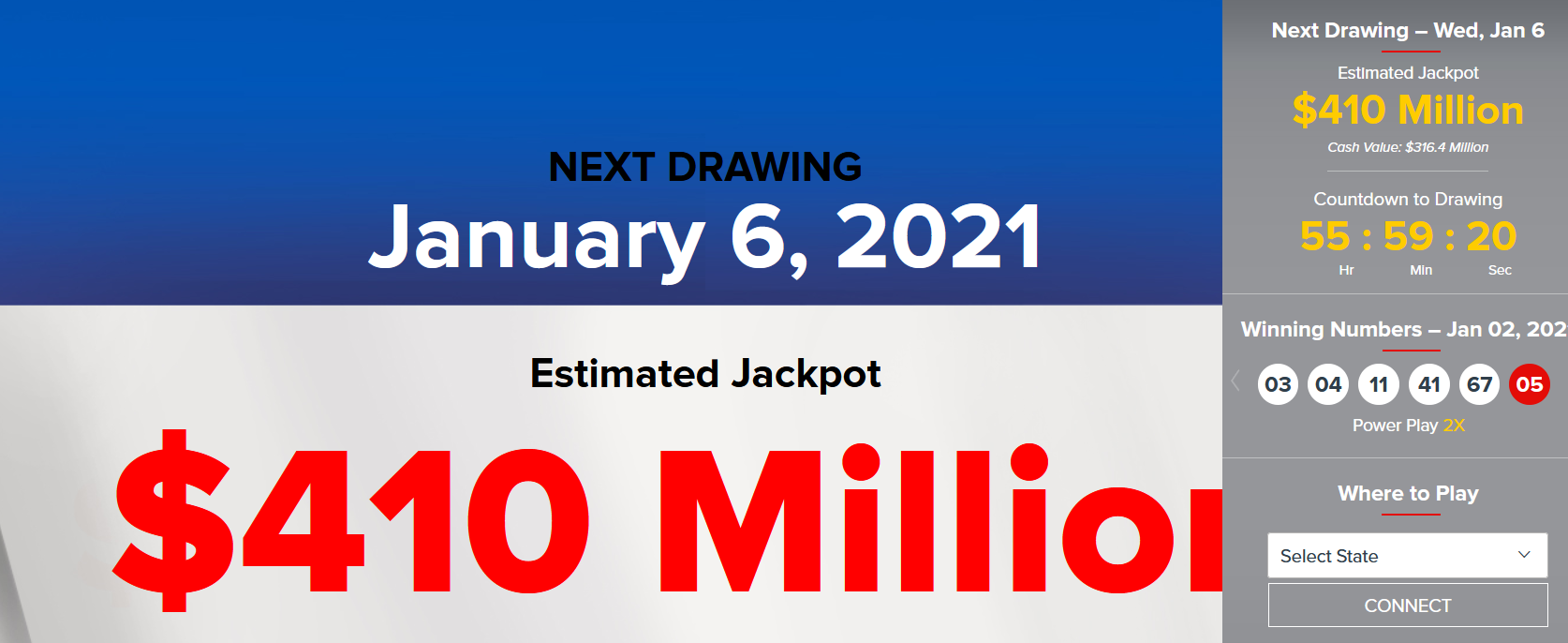 The jackpot for the drawing for January 6th was $410 million dollars so here we see this magical number manifesting again: