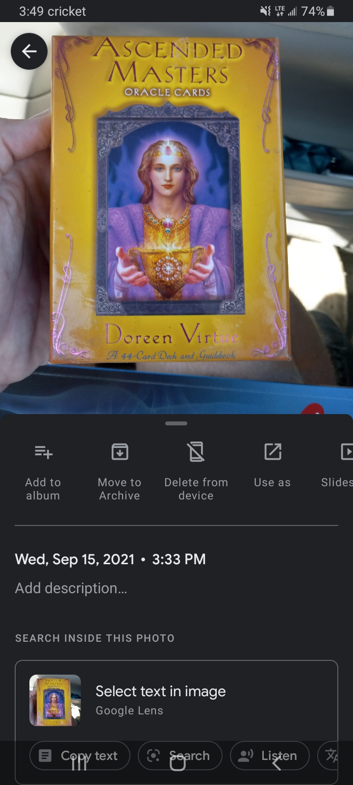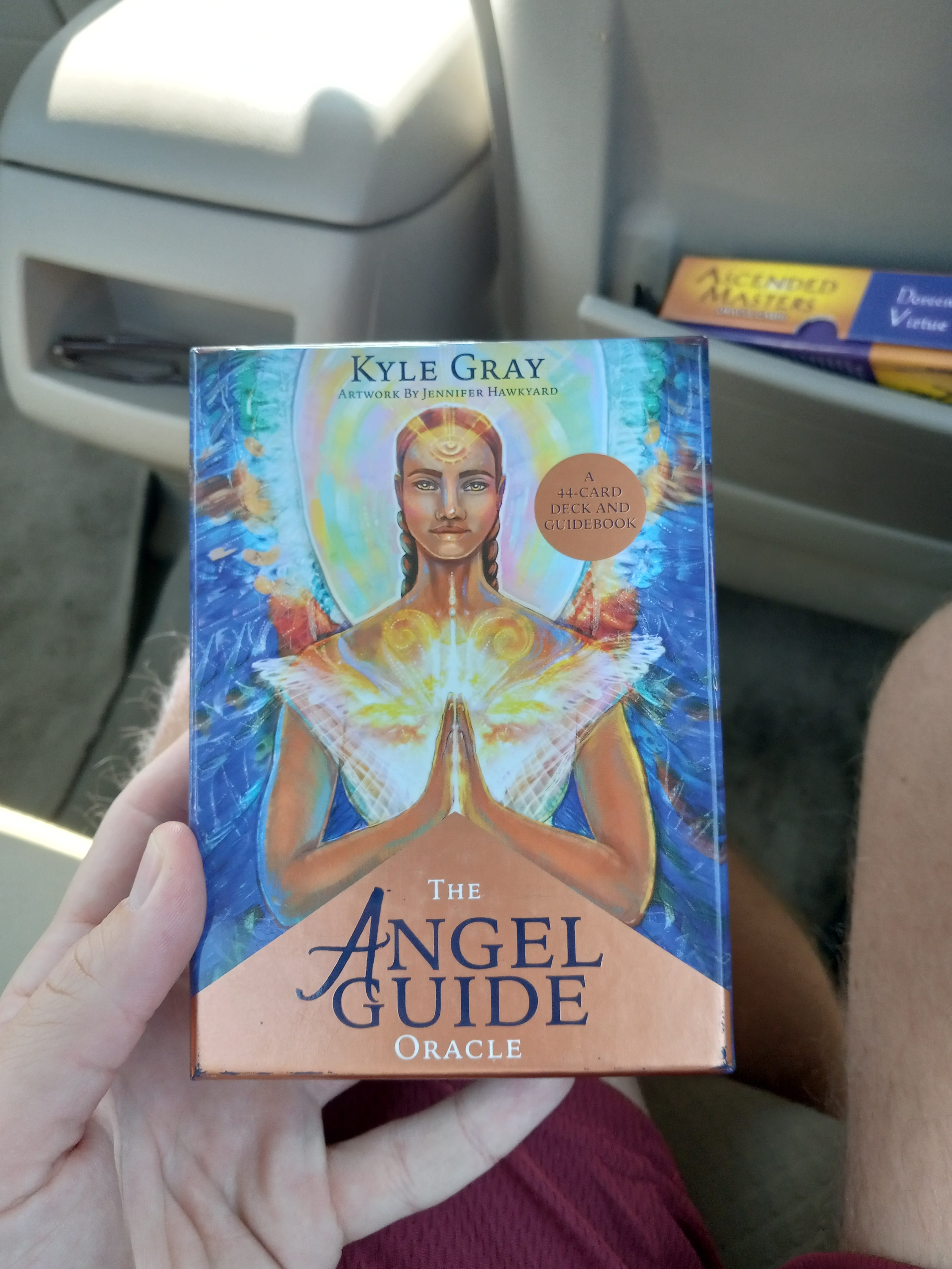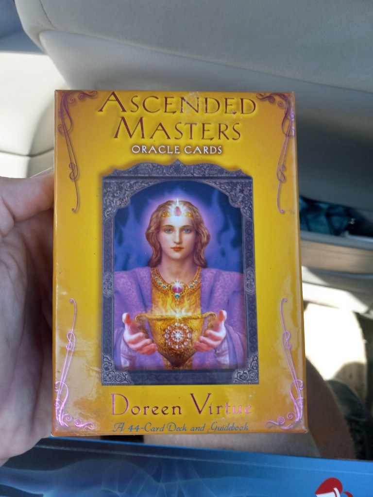So the class went well and I requested a Lyft ride on the app afterwards. I couldn’t believe my eyes when I got in the car and saw a box containing some divination cards with ‘Ascended Masters’ written on it in the storage area behind the seat: