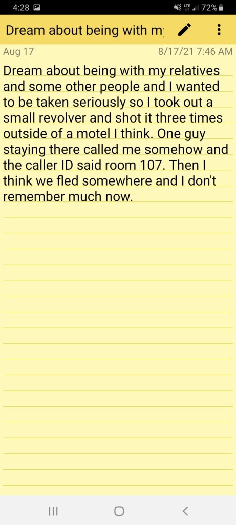 Here is another strange dream which was about being with some relatives and wanting to be taken seriously so somehow I had a revolver and shot it into the sky a few times ha: