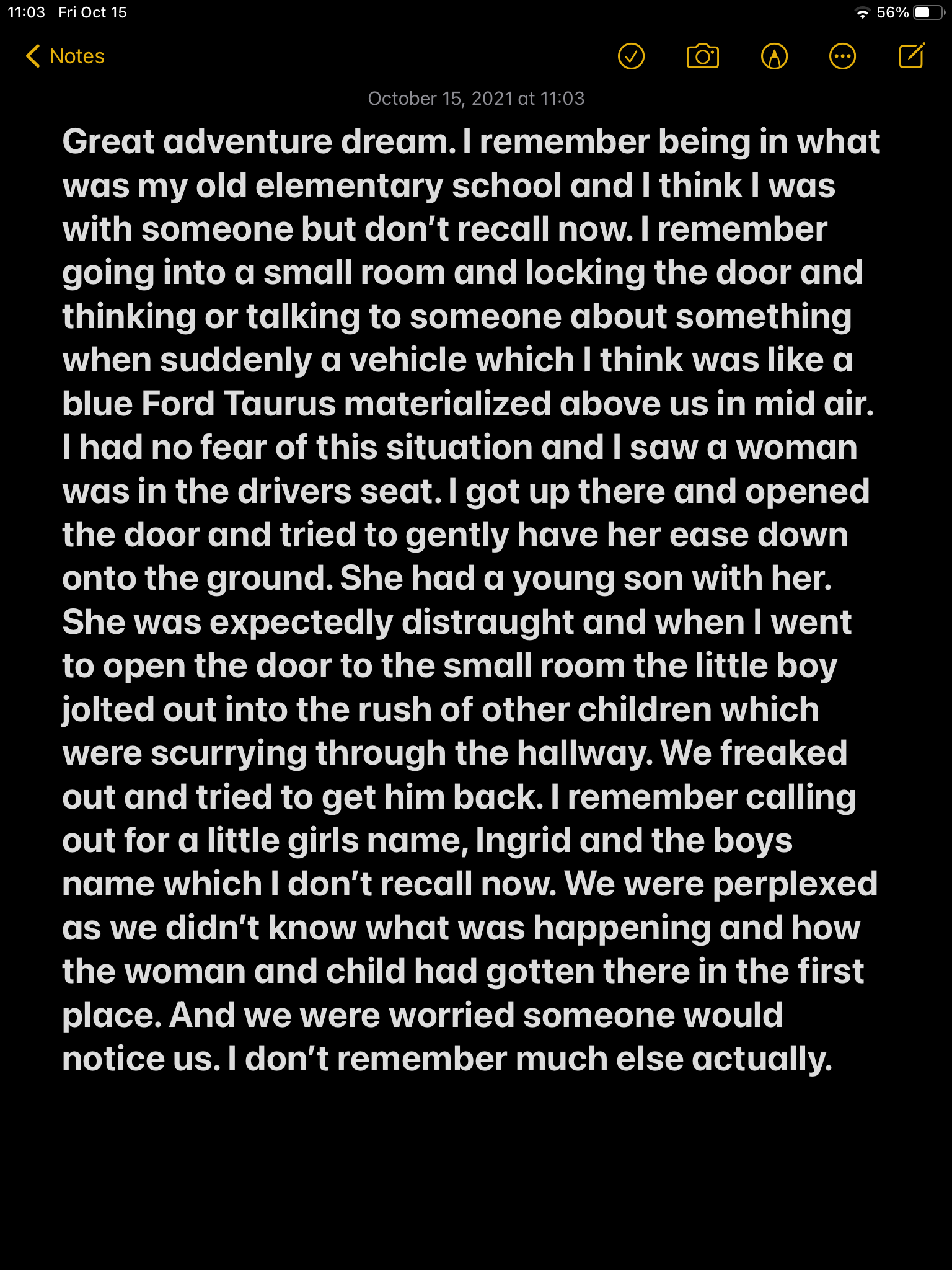 I remember going into a small room and locking the door and thinking or talking to someone about something when suddenly a vehicle, which I think was like a blue Ford Taurus, materialized above us in mid-air.