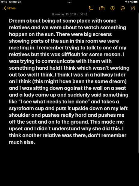 I think I was in a hallway later on (this might have been the same dream) and I was sitting down against the wall on a seat and a lady came up and suddenly said something like “I see what needs to be done” and take a styrofoam cup and puts it upside down and on my left shoulder and pushes really hard and pushes me off the seat and onto the ground.