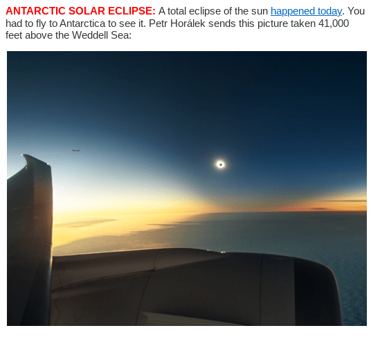 And speaking of 410, it appeared as the altitude amount for capturing today’s solar eclipse in the following photo on the front page of Spaceweather.com: