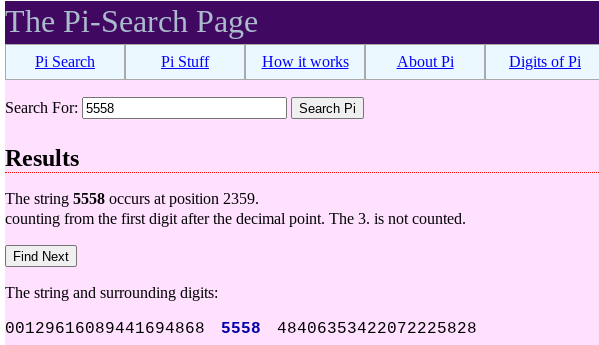 I would like to bring up the numerical position that 5558 takes in the Pi calculator which happens to be… 2359, the same time as the solar flare: