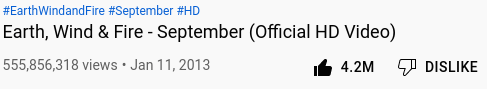 I just asked the Higher Ups which song I should include and I got telepathically ‘September’ and I knew which band they meant; ‘Earth, Wind & Fire.’ And if you can believe this, as of the time of this writing, the amount of views starts out at… 5558: