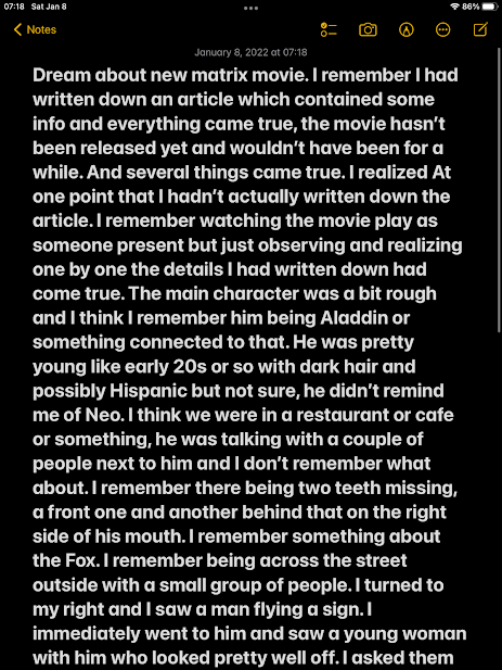Dream about new Matrix movie. I remember I had written down an article which contained some info and everything came true. The movie hasn’t been released yet and wouldn’t have been for a while. And several things came true.