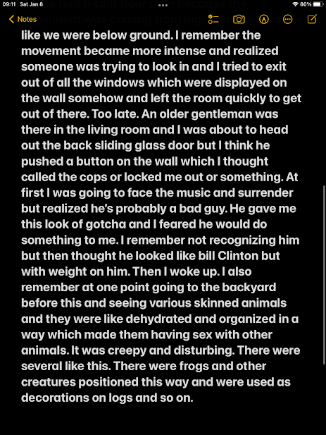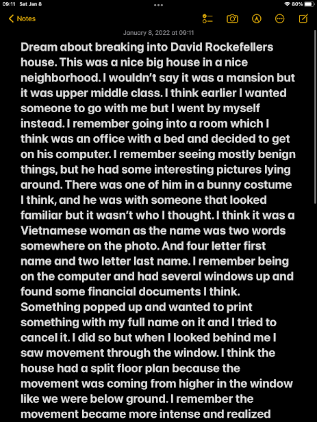 And there was also a pretty weird dream about breaking into the late David Rockefeller’s home with Bill Clinton possibly busting me: