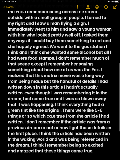 This dream was about seeing a new Matrix movie (different than this one that just came out) and referencing an article I had written that never existed which successfully predicted what happened in that movie. That definitely has to sound confusing and I apologize if I didn’t write this down well enough: