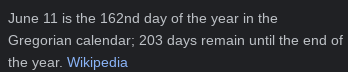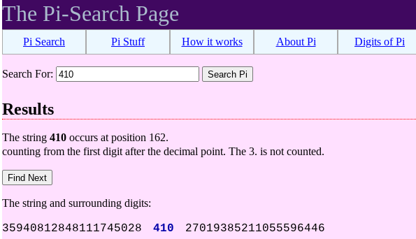 June 11th is the 162nd day of the year and if we plug the magic number 410 into the Pi calculator, which tells us the position of any number in Pi, we get 162:
