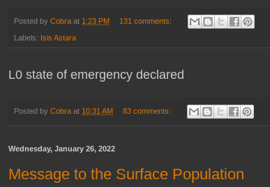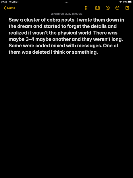 Amazingly, in the dream I saw what appeared to be 3-4 and maybe one more post in the group of posts and so far, since the dream, Cobra has posted 6 posts which are mostly coded messages along with a brief message to the surface population and a post regarding the anniversary of the murder of his soul mate, Isis Astara. I also wrote that one of them might get deleted and so far that hasn’t happened so I don’t know about that part.