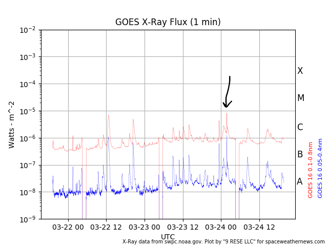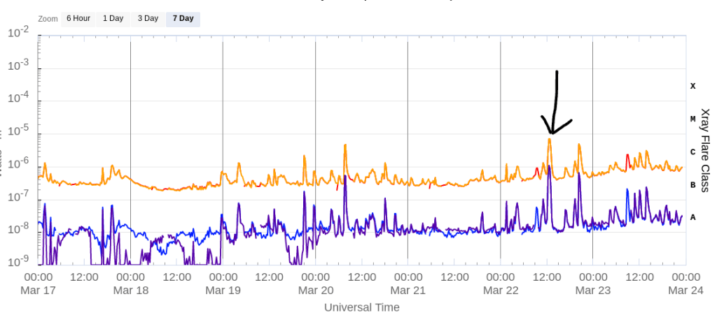 Then on March 22nd we had a big C-Class solar flare, and although the class they gave me wasn’t correct (it’s not always easy to figure out what they want to type out, they did point to ‘c’ on my keyboard at one point while I was trying to figure this out) it is the biggest one we’ve had in several days: