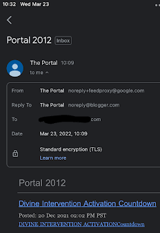 Very strangely, I got a notification about the December 21st, 2021 Divine Intervention Activation Countdown blog post from Cobra’s blog this morning, March 23rd. Perhaps the dreams are connected to this. The dreams happened early this morning and the email notification came in several hours later at 10:09 AM: