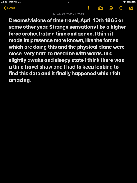 This next interesting experience(s) from March 22nd was a bit confusing and I wasn’t really able to word it properly but I had been watching a time travel show ‘Timeless’, and the same night some weird stuff was happening while I was trying to fall asleep. I felt powerful physical sensations from above I think: