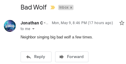 Last night , May 9th, I went to go hangout with the neighbors and after a while one of them starting singing the big bad wolf song (Who’s Afraid of the Big Bad Wolf). They did this a few times and I thought this might be a wolf spirit animal synchronicity.
