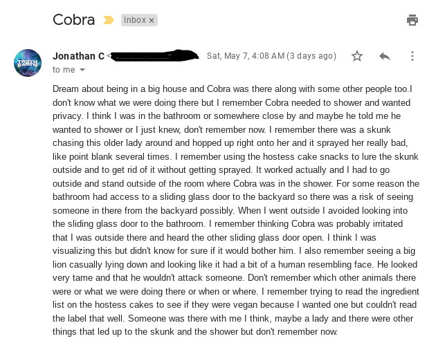 Dream about being in a big house and Cobra was there along with some other people too. I don’t know what we were doing there but I remember Cobra needed to shower and wanted privacy.