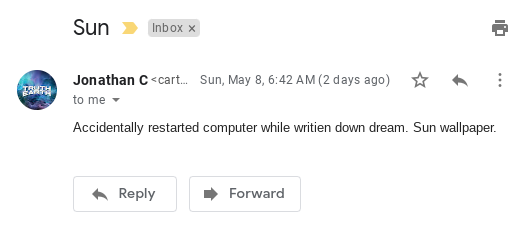 Additionally as interesting, while writing down a dream on May 8th I accidentally shutdown the computer (backspace is just under the power button, oops) and when I restarted it I saw the Sun wallpaper on the homescreen and thought this might not be an accident:
