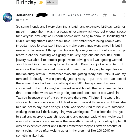 There was an amazing dream on July 21st which was a birthday celebration for myself which included appearances by celebrities (I think Jennifer Lawrence was there too but don’t remember much now). This dream ended up being amazingly prophetic: