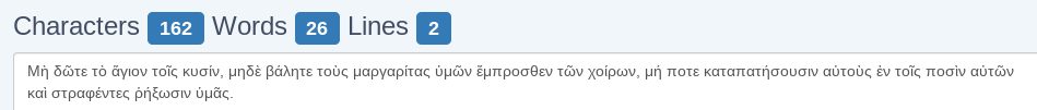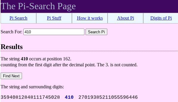 Very interestingly, this verse in Greek contains 162 characters, including spaces, and we know the magic number 410 takes position 162 in Pi. The Pi calculator tells us the position of any number in Pi: