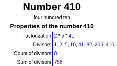 Adding 36 and 720 equals 756 and this is the sum of the divisors for the magic number 410: