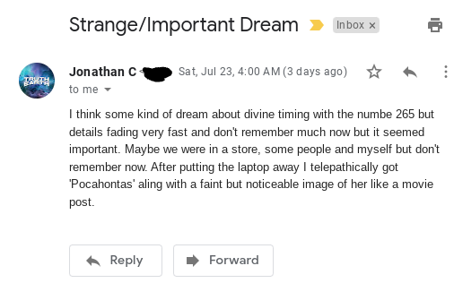 Before this though I had a dream that I couldn’t remember much of but it had to do with divine timing and Pocahontas was part of it along with the number 265: