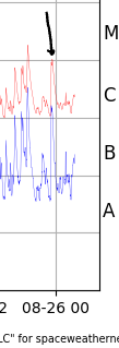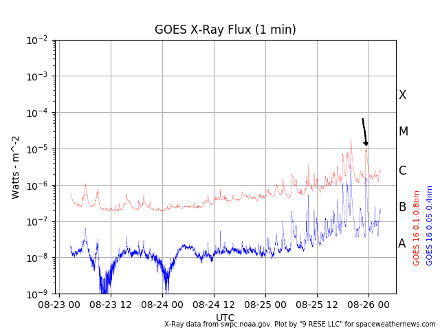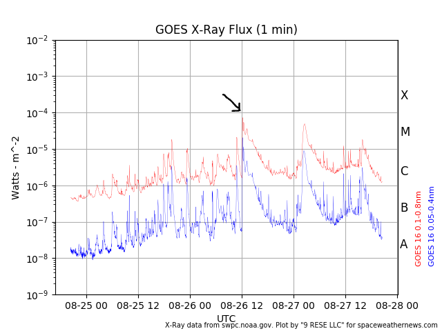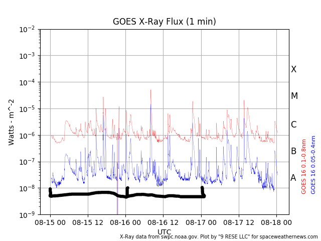 The first black divider is August 15th where the activity starts to increase and then in the next black divider it peaks the next day August 16th where we had an M5 solar flare: