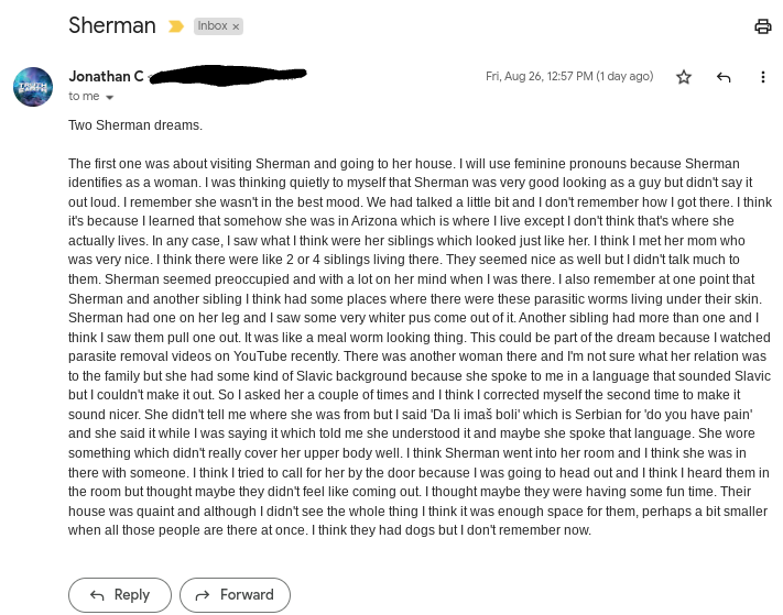 Here is a couple of dreams that pertain to Sherman who posts in the comment section of Cobra’s blog which I interpreted to be generally benevolent: