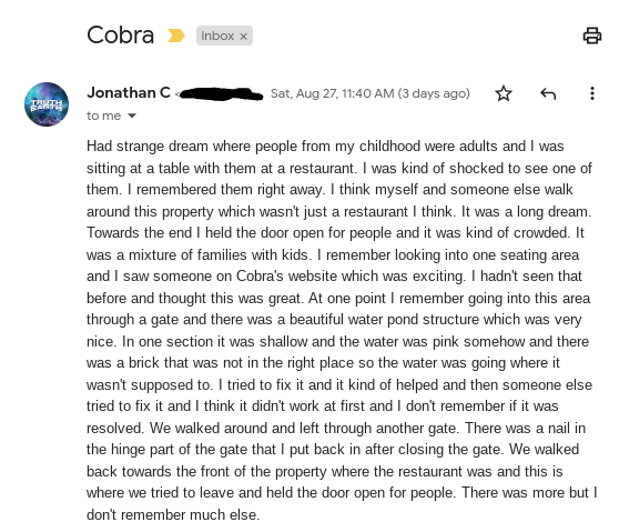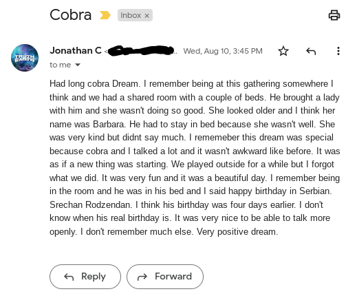 I remember this dream was special because cobra and I talked a lot and it wasn’t awkward like before. It was as if a new thing was starting.
