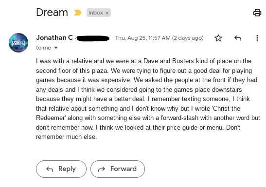 The ‘something’ seems to have been the following series of events. This part of the article will be the star attraction. On August 25th I had a dream where I was at a place like Dave and Busters (like an adult kind of Peter Piper Pizza place with games and food) and was texting someone. I don’t remember the rest of the message but I wrote ‘Christ the Redeemer’ after a forward slash, /, but I don’t remember what the other word was before the forward slash. I think the text message was generally benign. My sleep schedule has been kind of whack lately and I’ve been waking up later in the day which is why the dreams are written down later than usual: