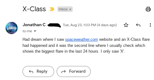 Interestingly on August 23rd I had a dream about seeing ‘X’ on the spaceweather website which I use to get information about solar activity. The X was where the solar flare information was except it was just an X and nothing else. So I’m interpreting this as perhaps not predicting an X-Class flare but that a certain upcoming flare would be very important as X = highest class possible for a flare. If it’s the M-Class flare that happened a couple of days later on August 25th at 12:51 PM I would say that was a very important one as it related to the above Jesus dream.