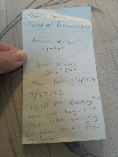 Very strangely, while reading one of the books on my bed, I looked over at my closet and saw the hangers were swinging like someone had tapped them. It wasn’t a slight swinging either it was like if I had used my hand to make them noticeably swing but not too hard. I thought some air from my swamp cooler (which is pretty small) was pushing them but the air doesn’t go directly in my room. My door only opens half way because the hinges aren’t on correctly so not a lot of air can really get in from the location of the swamp cooler which is in the living room on the other side of a long wall. I just stared at the hangers to see if they would move again. And they haven’t since that time. This happened while I was reading the Rosicrucian book and didn’t think this was a coincidence.