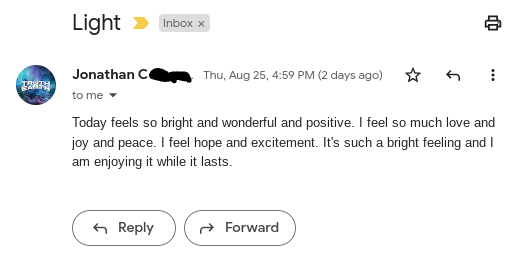 August 25th was the day I experienced a taste of the wonderful peaceful, blissful, effortless, calming and benevolent energy which I think is going to be the norm after The Event: