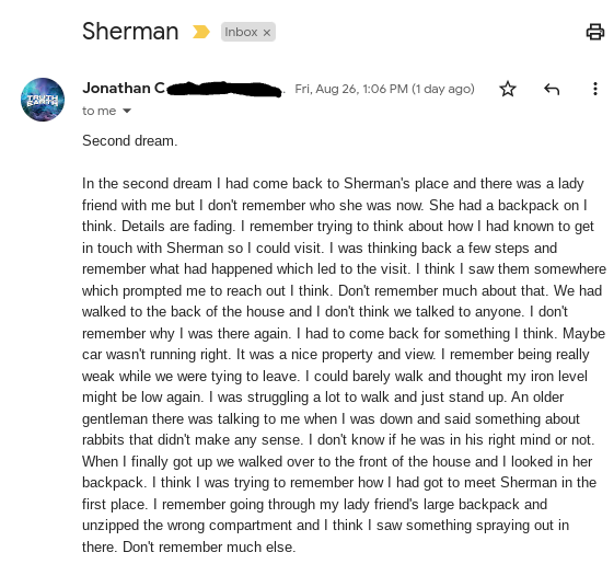 In the second dream I had come back to Sherman’s place and there was a lady friend with me but I don’t remember who she was now.